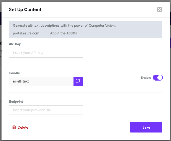 | **handle**                            | String    | '`ai-alt-text`'                          | Represents the identifier for the specific add-on handling alt text generation.                                                                                 |