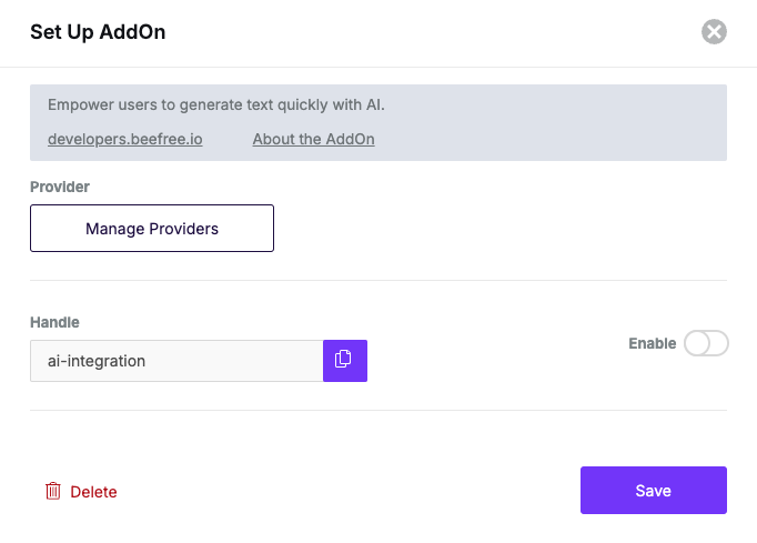 A toggle element to enable and disable the AddOn. When toggled *OFF,* the AddOn is not visible to end users of the builder in your application.