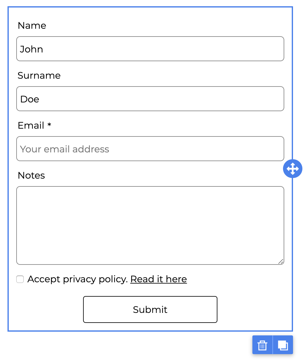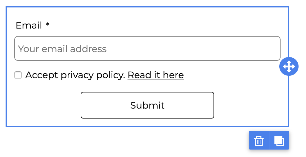 When added, the form shows the minimum fields for submtting an email, e.g. for subscribing to a newsletter: