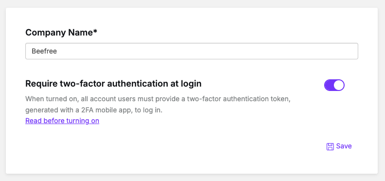 If you’re an account owner (i.e. the user who created the Beefree SDK account), you may require all account users to use two-factor authentication to log in. To do so, go to the *Setting & Security* section in your personal area and enable *Require two-factor authentication at login*.
