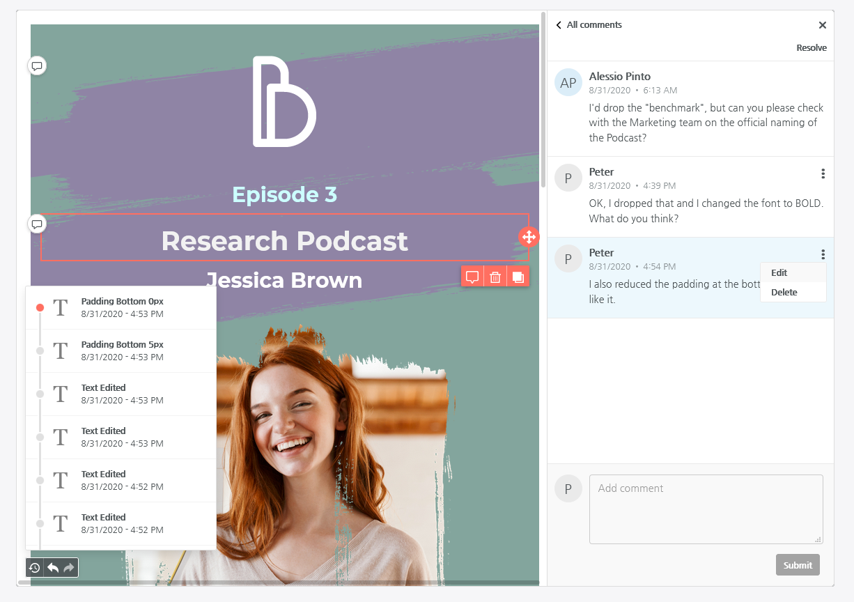 **Existing comments** can be **edited** or **deleted** by the contributor that added them. Contributors may also **resolve comments** when they have reached a consensus and completed any pending task.
