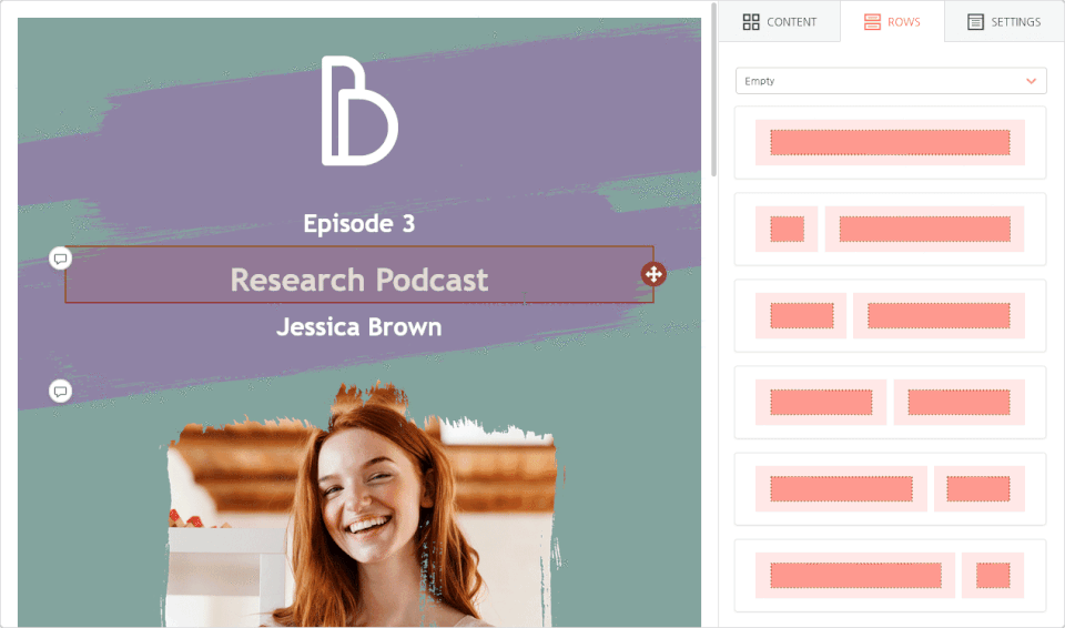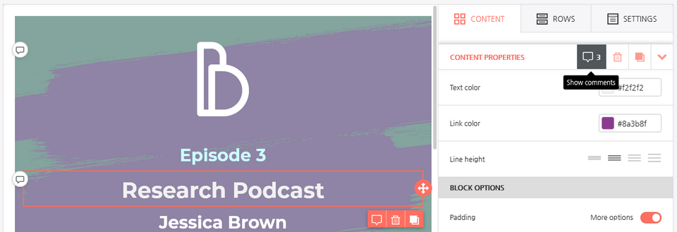 If there has already been some activity, the editing stage shows whether a content block or row has any comments by displaying a small comment icon. The sidebar instead indicates the number of existing comments for the selected row or content block, three in this case.