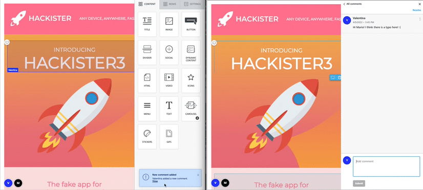 With Commenting, you enable **asynchronous, visual collaboration** when multiple collaborators are creating, editing, and reviewing content in the Beefree builders. This collaborative feature can prove extremely beneficial in different contexts, regardless if contributors are in the same team, in separate teams, or even in different companies (e.g. digital marketing agencies collaborating with their clients):