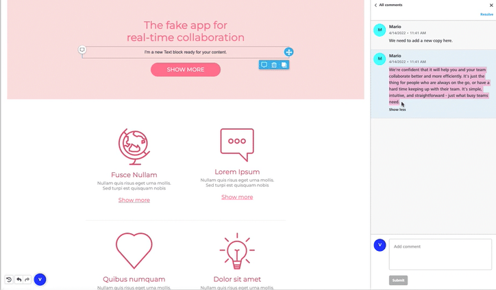 * **Add a new comment** in any content block or row, so that the **context** of the discussion is always visible;
