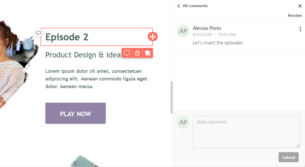 With Commenting, teams using your application can **collaborate asynchronously** on the same email, page or popup, in order to **get their work done** more quickly and **reach approval** for going live more efficiently.