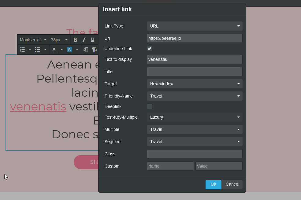 With **Custom Attributes**, your end users can easily append **additional information to HTML tags** in emails and web pages, at the same moment they are creating their content in Beefree SDK. These attributes can be **applied to links**, both in text blocks and buttons, **and images**, and they serve a variety of scenarios: personalization, segmentation, styling, accessibility, etc.