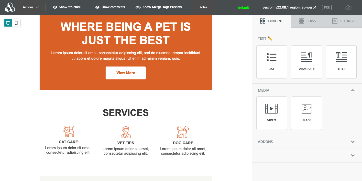This feature is available on Beefree SDK [Superpowers plan](https://developers.beefree.io/pricing-plans) and above. Upgrade a [development application](https://docs.beefree.io/beefree-sdk/~/changes/480/getting-started/readme/development-applications) at no extra charge to explore features from higher plan tiers. **Note:** Usage on a development application still counts toward [usage-based fees](https://devportal.beefree.io/hc/en-us/articles/4403095825042-Usage-based-fees) and limits.