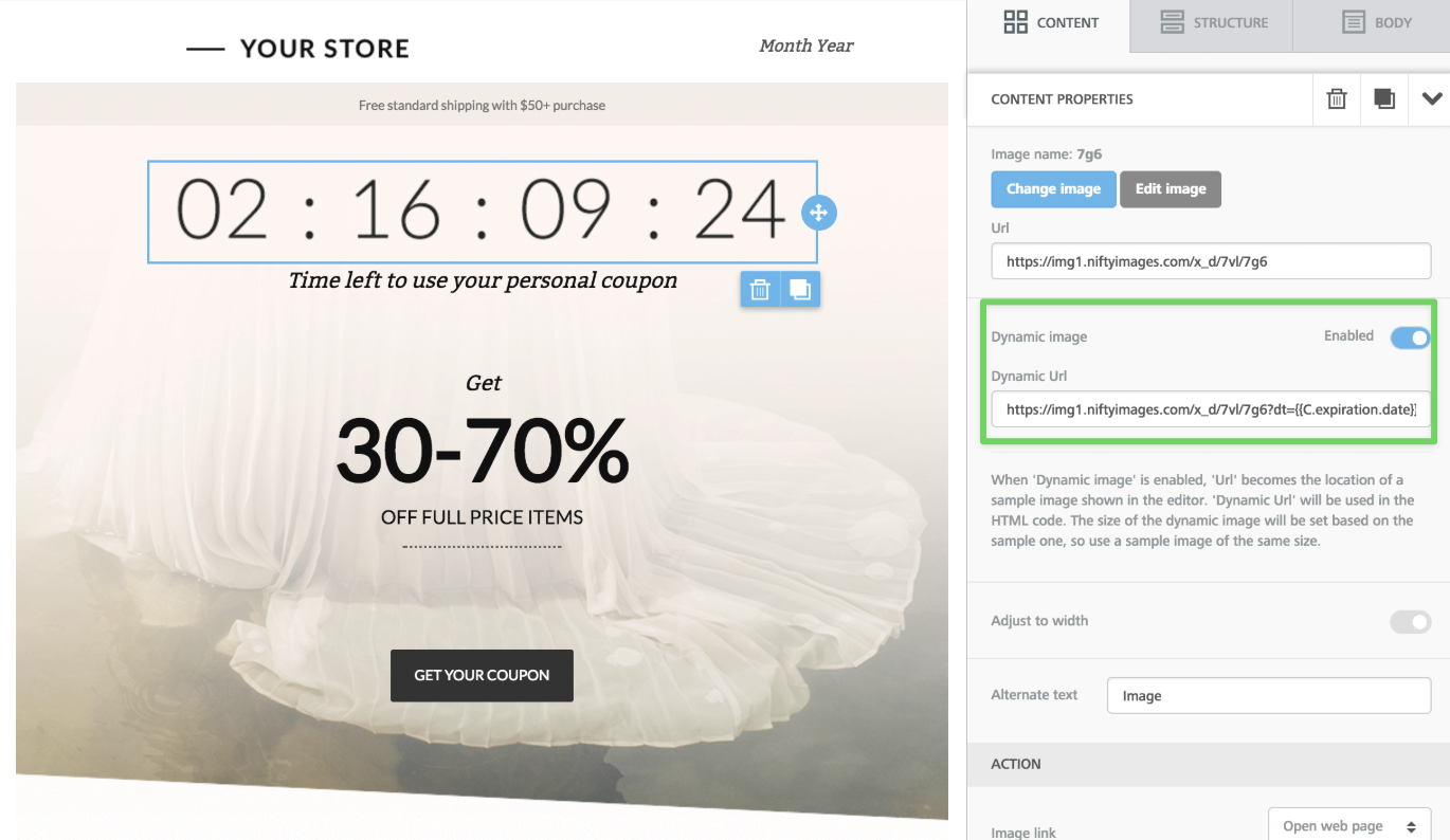2. In the **Content** tab, navigate to **Image Properties** and toggle **Dynamic image ON**.