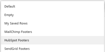 * **Custom rows**: The MailChimp Footers, HubSpot Footers, and Sendgrid footers are additional options added to the drop-down through the [Custom Rows feature](https://docs.beefree.io/beefree-sdk/~/changes/480/rows/reusable-content/create/pre-build/implement-custom-rows). When an end user clicks on any of these three options, they will be redirected to the lists of rows available in that external resource.