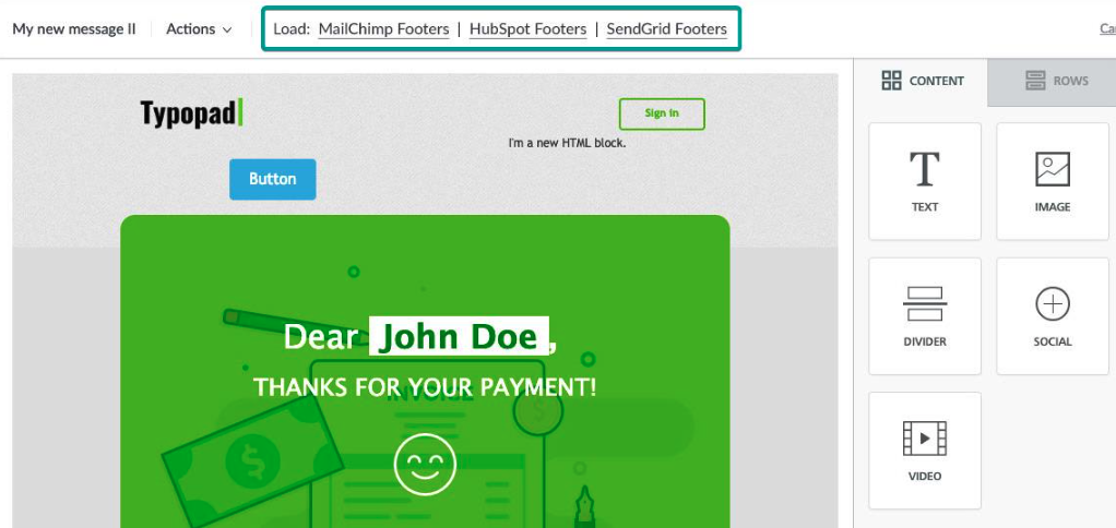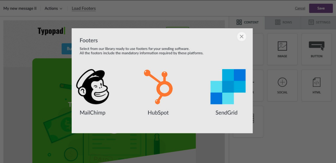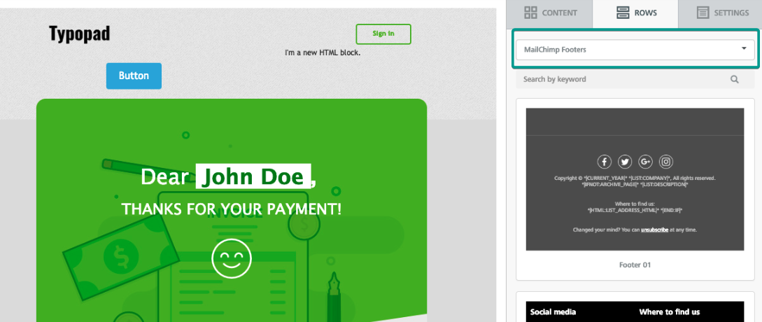 When users click on MailChimp, the modal window fades off, the builder switches to the “Rows” tab, and the MailChimp Footers are shown, ready to be dragged into the message.