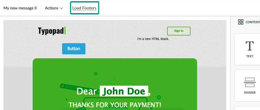 But what if you wanted users to select the email footers they need from a large catalog of pre-built content? In that scenario, you could have a more generic “Load footers” call-to-action in the toolbar.