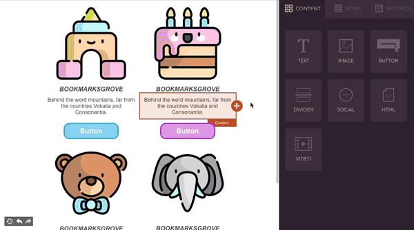 Saved Rows allows end users to select a row in a design and save it for later use. More specifically, it allows end users to submit a request to the host application to save a piece of content and turn it into a reusable element. The host application, using `externalContentURLs`, can feed these saved elements back to the builder as rows that can be dragged into other designs.