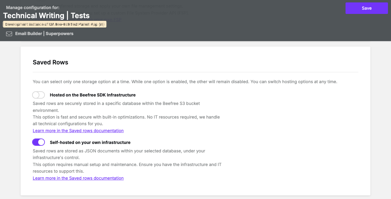 Take the following steps to enable Self-hosted Saved Rows in the [Beefree SDK Developer Console](https://developers.beefree.io/login?from=website_menu):