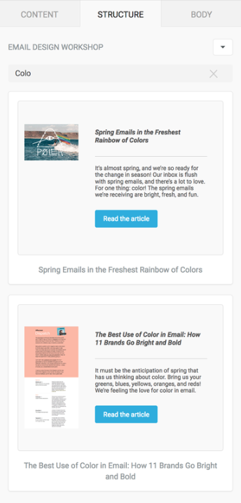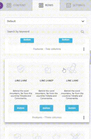 The search field allows users to narrow down the content shown after they select a list of [custom rows](https://docs.beefree.io/beefree-sdk/~/changes/480/rows/reusable-content/create/pre-build/implement-custom-rows).