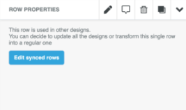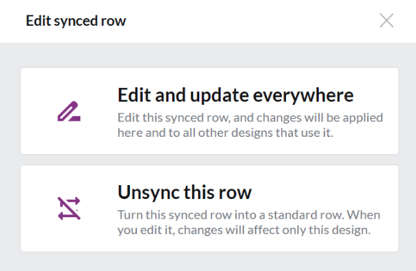 The first option, to edit the row across all designs, allows users to make changes to the synced row that will be reflected in all designs that use it.