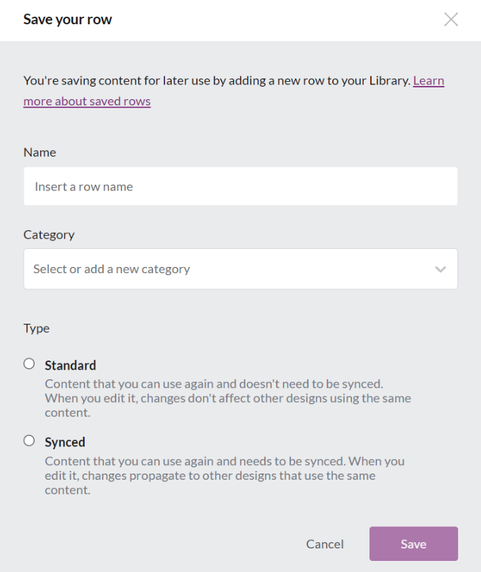 The second option, to unsync the row, converts the synced row into a standard saved row. This means that any changes made to the row will only affect the design in which it is being edited. This option is useful when the user needs to make specific changes to a single design without affecting other designs that may use the same saved row.