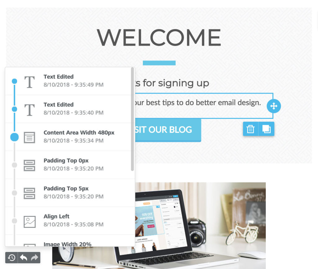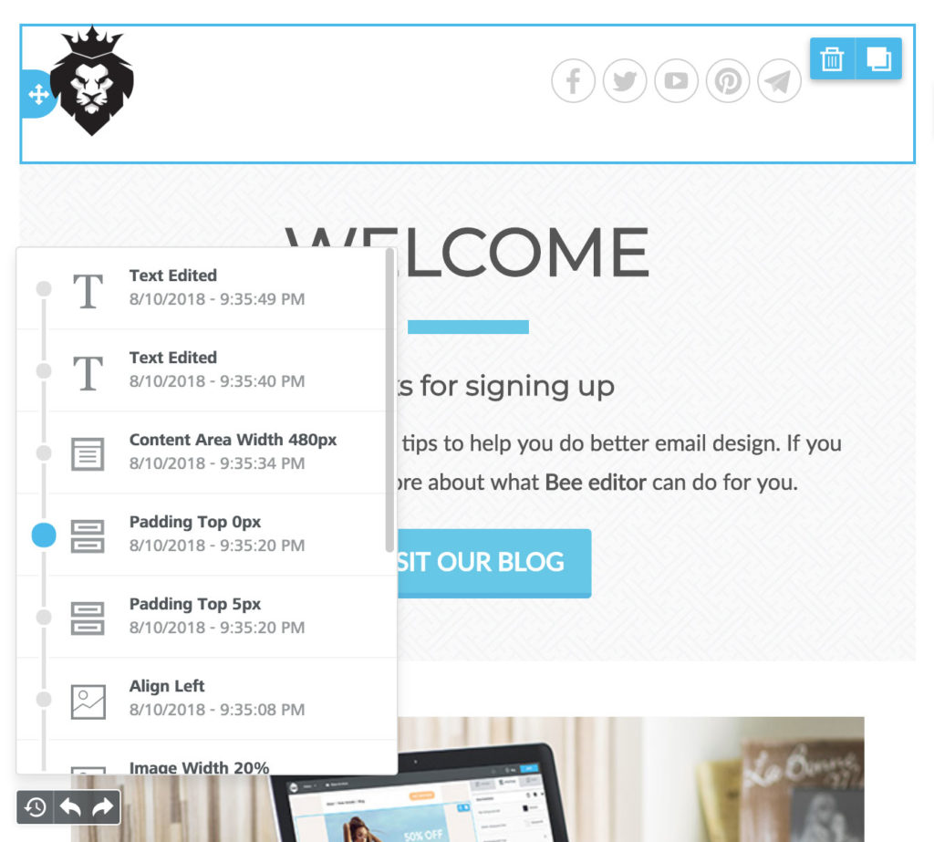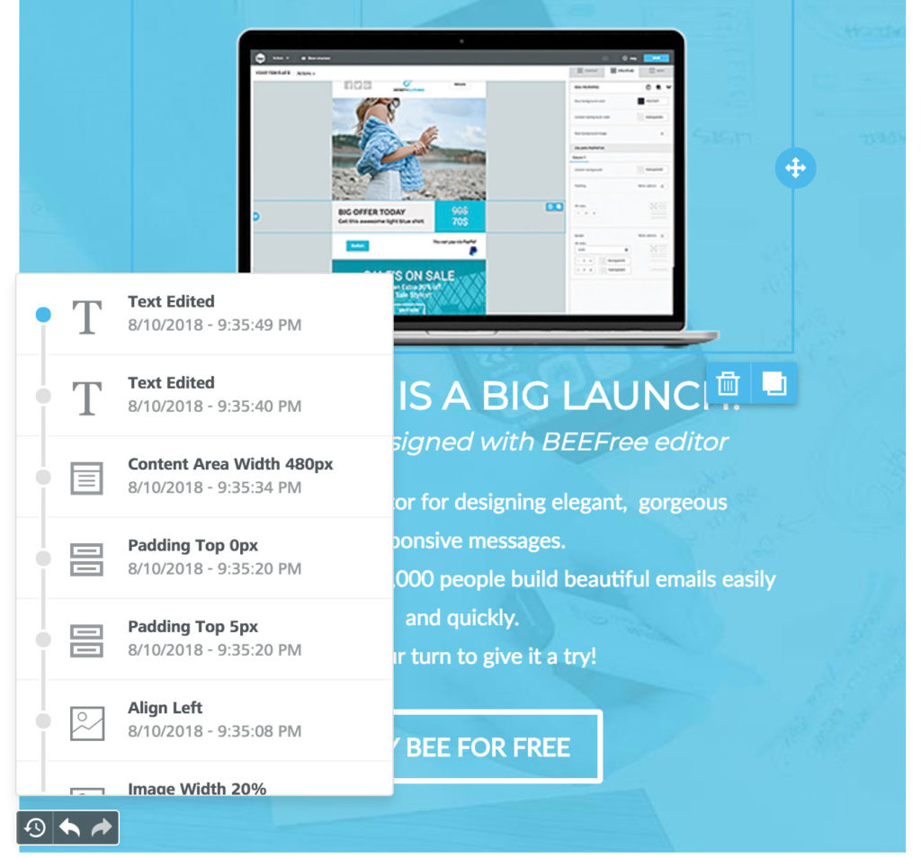 Your users will have the ability to rewind and fast-forward to any point in their recent edit history. Once *Undo* is enabled in the [Beefree SDK Console](https://developers.beefree.io/), the application immediately begins tracking changes. Behind the scenes, this is accomplished via a new callback event – [called onChange](https://docs.beefree.io/beefree-sdk/~/changes/480/getting-started/tracking-message-changes) – which can also be used “stand-alone” without enabling *Undo*. No client-side configuration is required to use this feature. Continue reading to learn how to activate and use *Undo*. And if you can’t wait to try it yourself, you can immediately do so at [beefree.io](https://beefree.io/templates/)