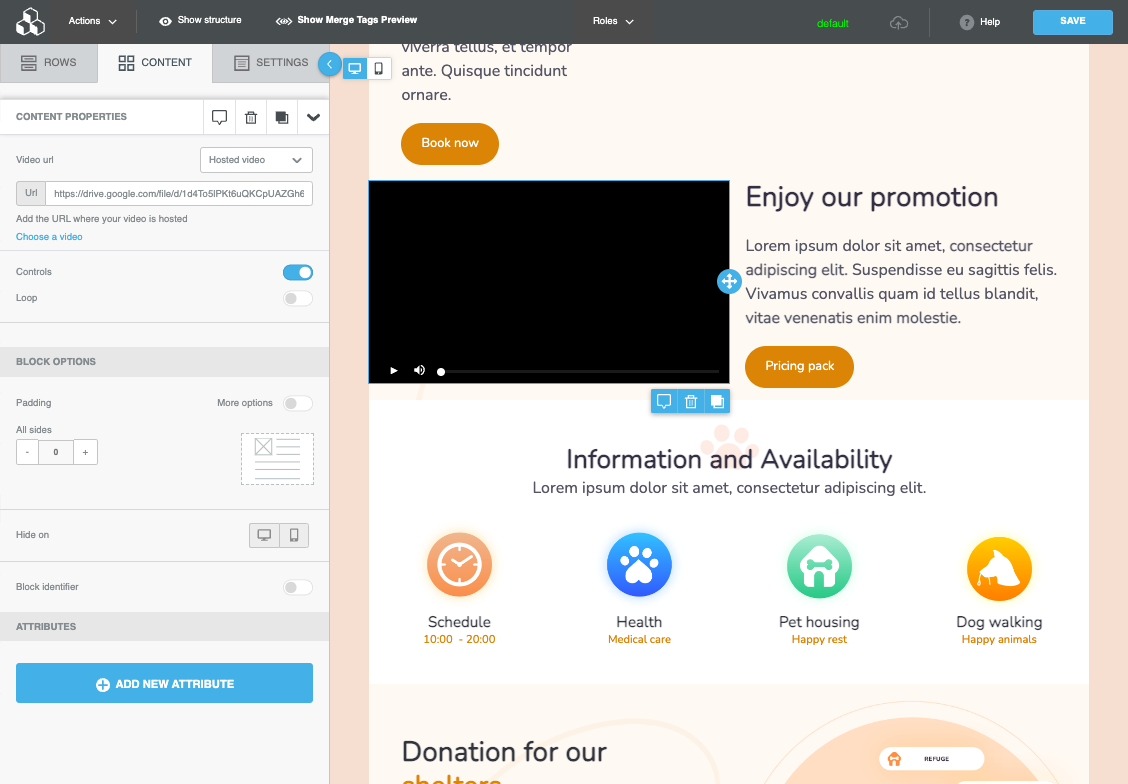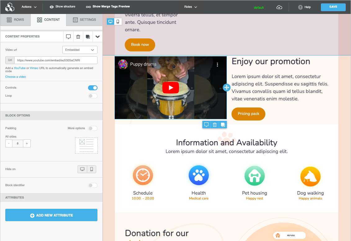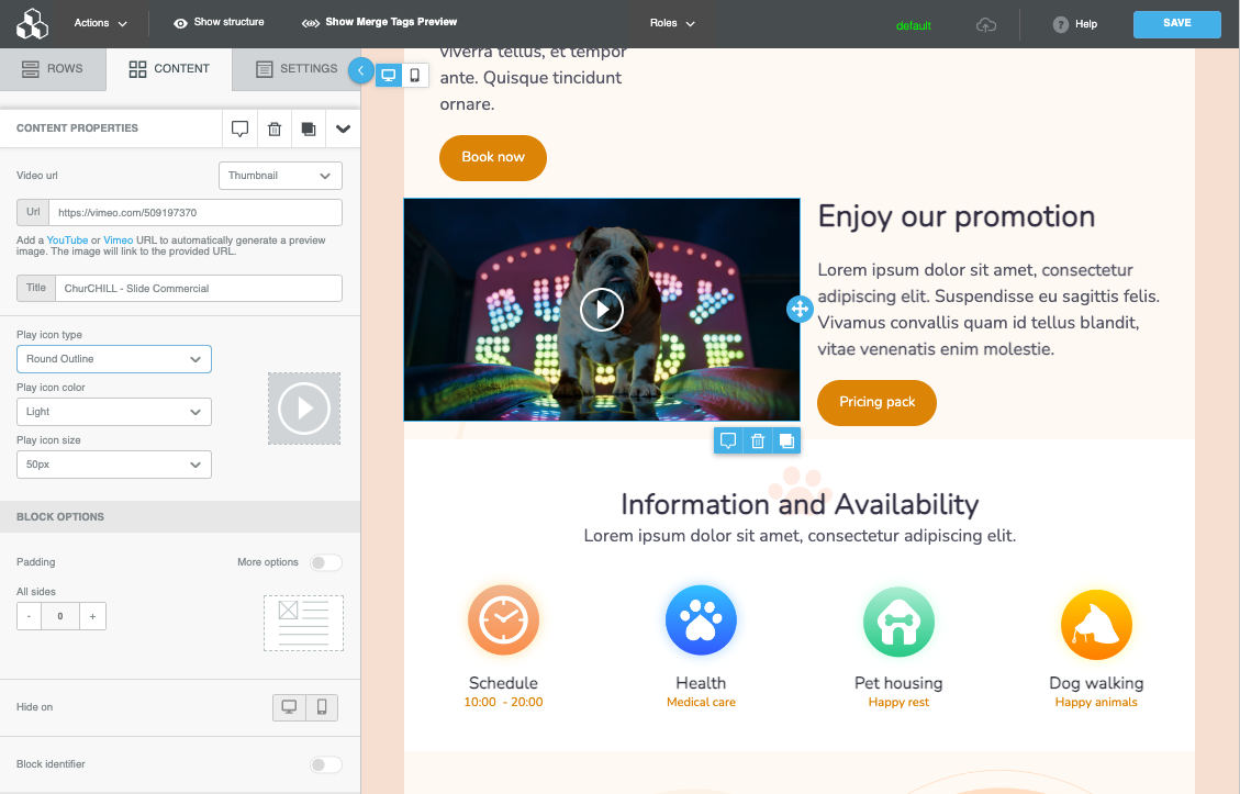 There are multiple ways to add a video to a page built with Beefree SDK. Additional settings allow the video progress bar and loop playback to be turned on or off.