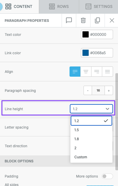 4. Scroll under the content block's properties, until you find the **Line height** drop-down option.&#x20;